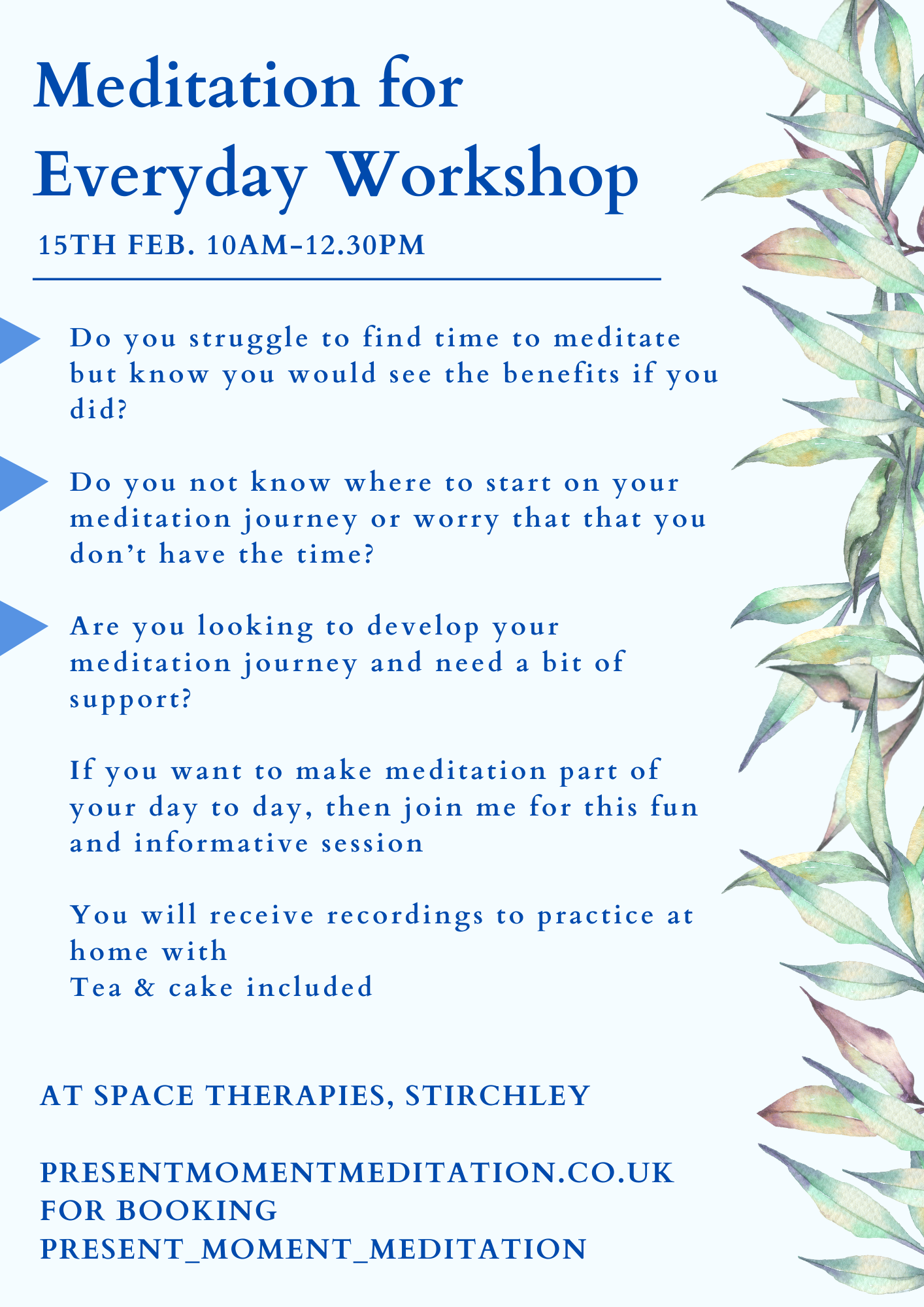 During this 2.5 hour workshop I’ll guide you through meditation for everyday. If its time out on your lunch break, wanting to reset after work or if you have time while waiting in the supermarket queue and want to make meditation part of your day to day, then join me for this fun and informative session.